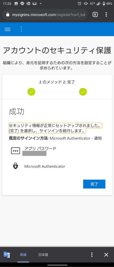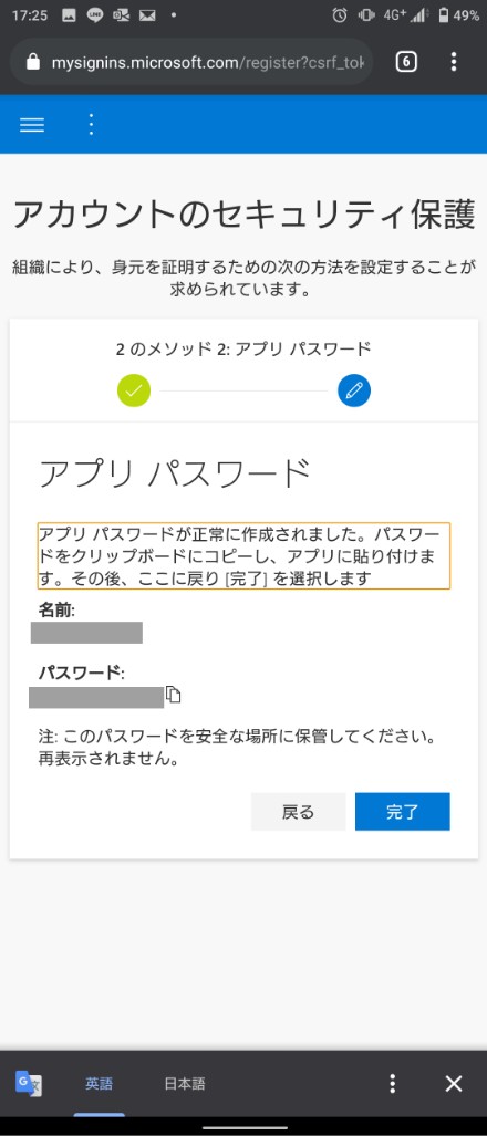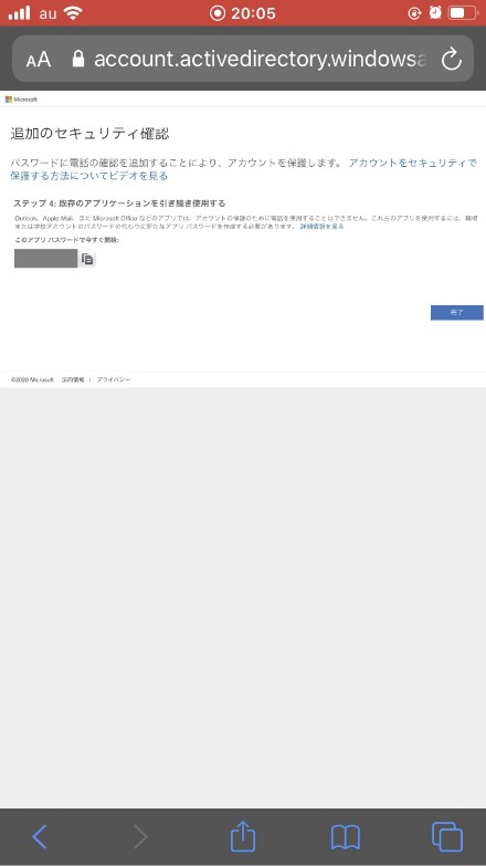 多要素認証が使用できないときのためのアプリパスワードが表示されますが、必要な時にユーザが発行できますので保管しておく必要はありません。