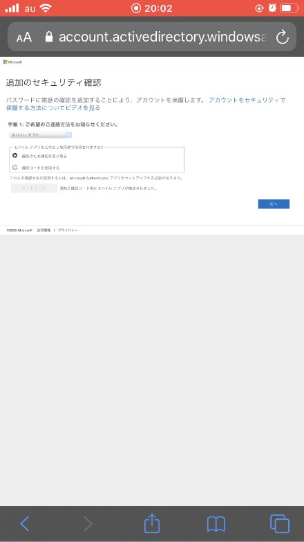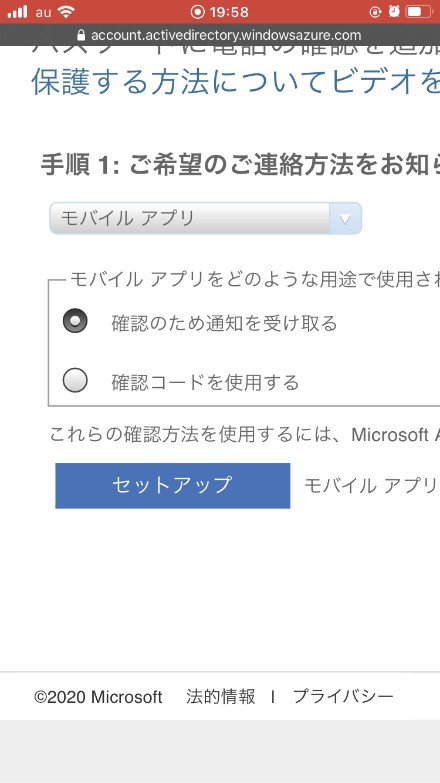 1. 以下の画面が表示されるので、[モバイルアプリ]と[確認のための通知を受け取る]を選択し[セットアップ]をタップしてください。