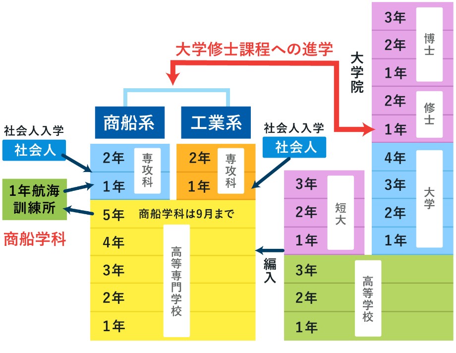 専攻科は、高等専門学校本科5年間(商船学科は5年6ヶ月)の教育課程の上に、高度な専門知識と技術を教授し、創造性豊かで技術革新と社会情勢に対応できる高度な海運管理者・開発技術者を育成するために設けられた2年制の課程です。
